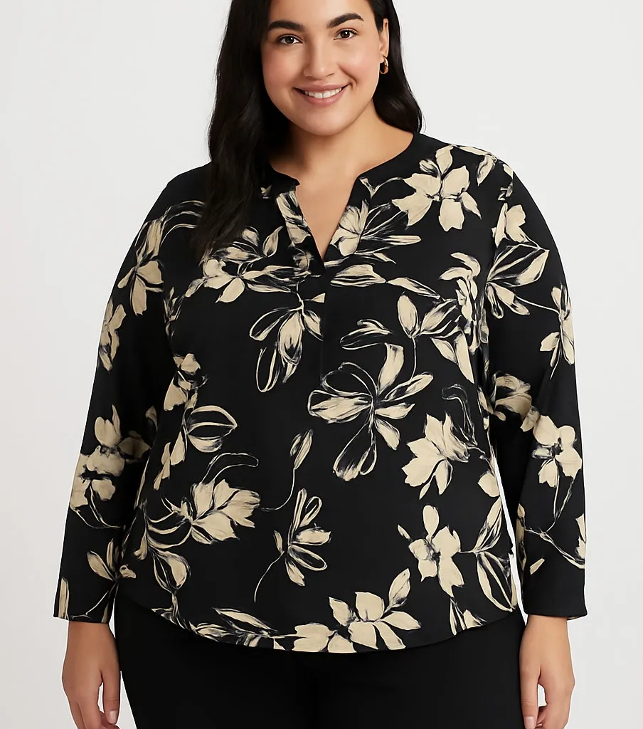 BRAND: Zac & Rachel Woman SIZE: Women’s 1X (Plus Size) COLOR: Black with Beige Floral Print MATERIAL: 95% Polyester, 5% Spandex CARE INSTRUCTIONS: Machine wash cold gentle cycle, lay flat to dry Stay stylish in this chic Zac & Rachel Woman blouse. Featuring a flowy fit in a black and beige floral print with lightweight stretch fabric, this versatile top is perfect for work, casual wear, or layering. The long sleeves and flattering silhouette make it an ideal wardrobe staple. Wear it tucked into trousers for office chic, or pair with jeans for an effortless weekend vibe. Gently pre-loved and ready for a new closet. Measurements (flat lay, approx): Pit to Pit: 23 in Length: 27 in Condition: Excellent pre-loved condition, no major flaws noted. Model photo and video are AI-generated.