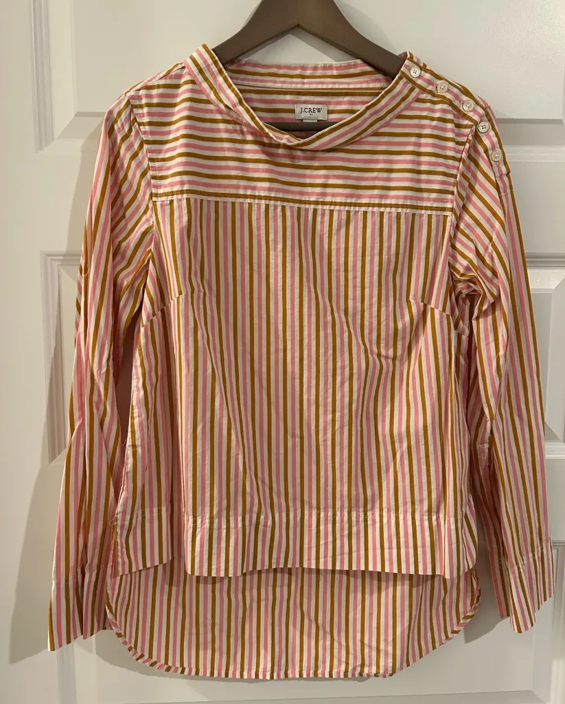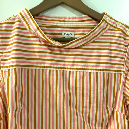 J Crew Striped Funnelneck Top in Cotton poplin, white pink bronze brown, size 4 100% cotton High low... Show more