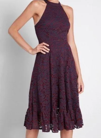 ModCloth A Night Like This Navy Blue Sleeveless Trapeze High-Neck Halter Formal Midi Dress With Burg... Show more