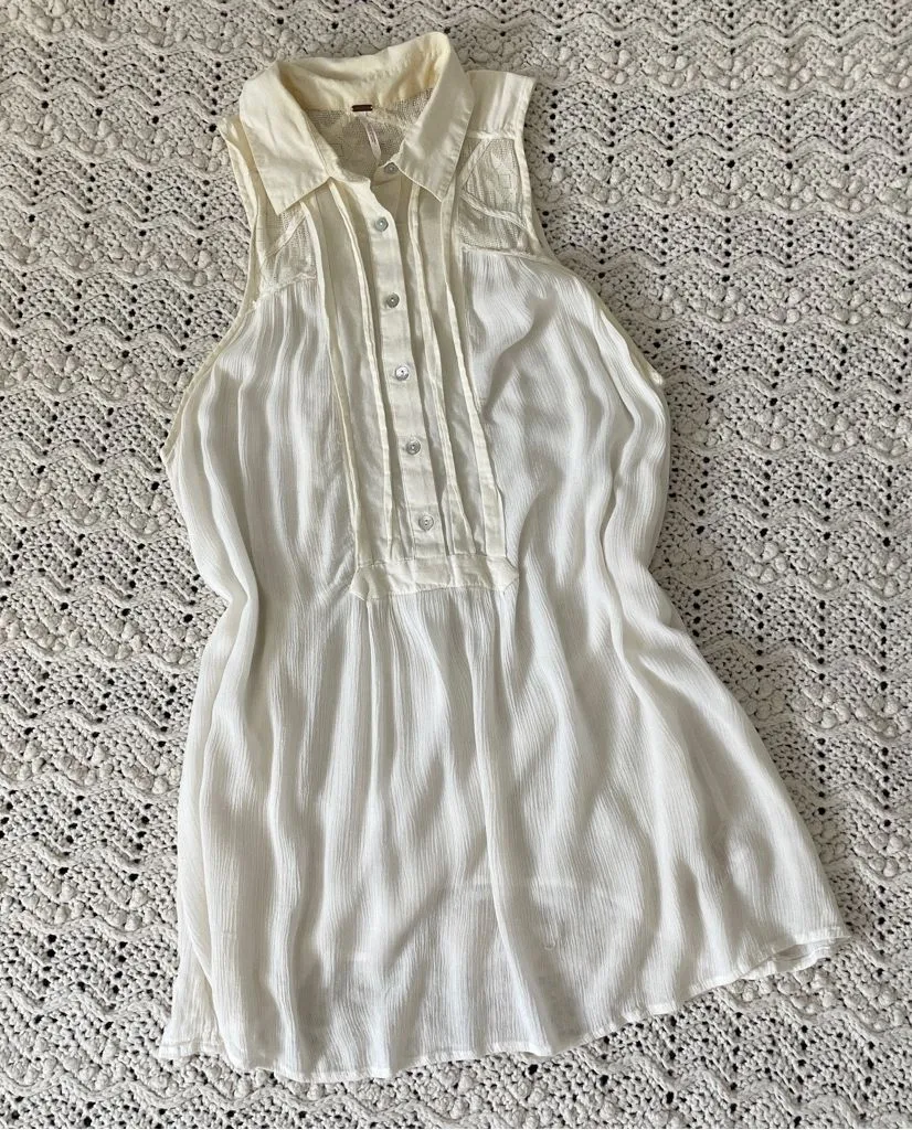 Free People Gauze Sleeveless Lace Tunic Top in the color Cream. Sleeveless. Collared neckline. Lace... Show more