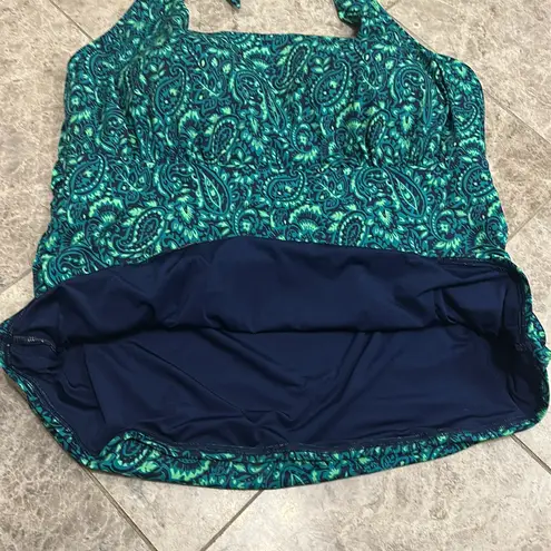 Lands End Plus Size Long Torso Square Neck Halter Tankini Swim Top Size: 22W/L Color: Blue Green Paisley Halter neck tie Square neckline Fully lined Built in shelf bra Long length Chlorine resistant UPF 50+ Excellent pre-owned condition! Minimal wear! No flaws noted. Smoke free home