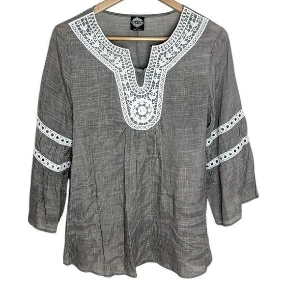 CalStyle Gray Brown White Crochet Trim Style boho popover tunic Great used condition, Size S Style... Show more
