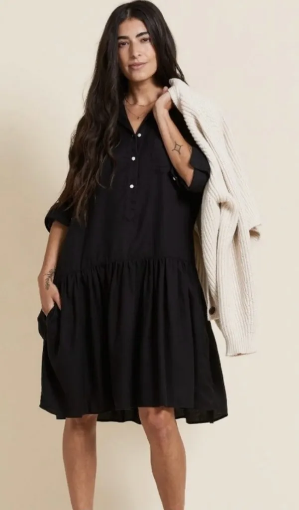 Frank & Eileen Grayson the Changemaker dress in black liquid lyocell Frank & Eileen Grayson the Changemaker dress in black Collared shirt dress Oversized fit Drop waist 3 front buttons Button cuff sleeves Long sleeves Chest pocket and side pockets size 01 XS Approximate lay flat measurements: Armpit to armpit 21 inches across Shoulder to hem 35 inches Sleeve 24 inches No issues Material: 100% lyocell