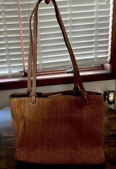 . COLOR: tan MATERIAL: wicker, leather SIZE: 12”x10”x3.75” STRAP DROP: 12” SERIAL#: 78082 Clas... Show more