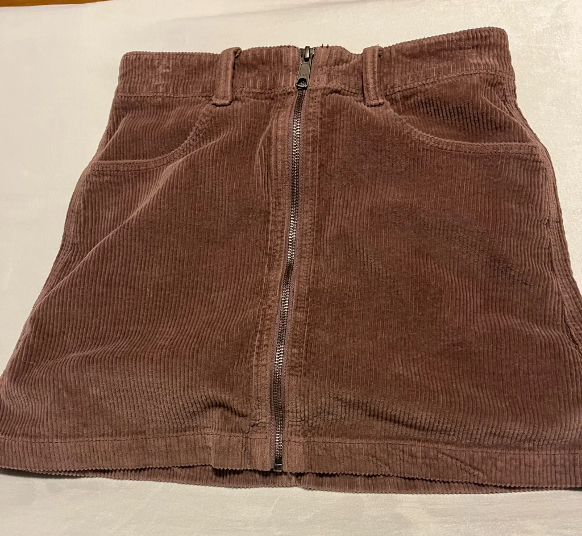 Trendy brown corduroy mini skirt with front zipper. Perfect for casual outings.