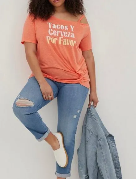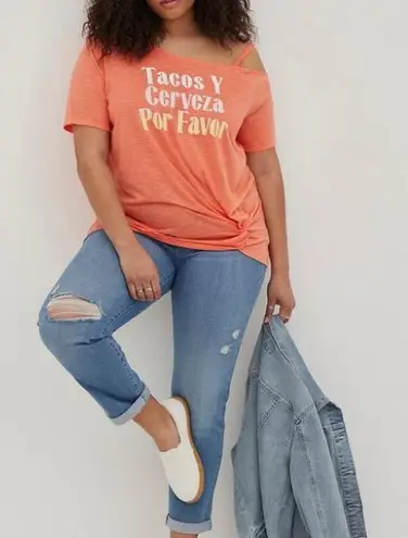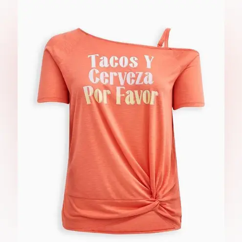 Casual orange tee with 'Tacos Y Cerveza Por Favor' text. Features a relaxed fit and knotted detail.... Show more