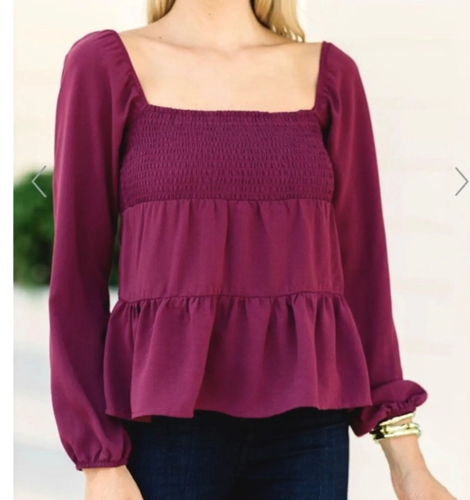 Paper Crane Berry Smocked Square Neckline Long Sleeves Tiered Top Blouse Size Medium NWT Adorable... Show more