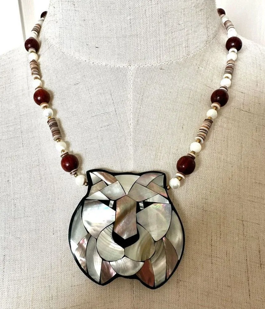Lee Sands vintage 70’s mother of pearl lion pendant necklace Mosaic head design Unsigned... Show more