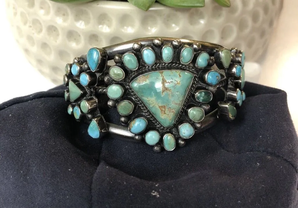 This is a fabulous signed Navajo sterling silver Turquoise Mountain turquoise cuff bracelet. This bracelet features 38 beautiful bezel-set pieces of Arizona Turquoise Mountain turquoise in the cluster style with silver roping and silver solder balls separating the pieces of turquoise on a tri-split bracelet. 70 grams