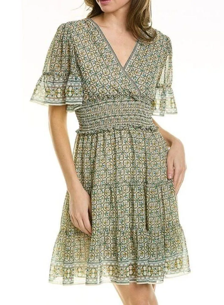 Cream & green fleur-de-lis print. Surplice front. Flutter sleeves. Smocked waist. Lined. 100% polyes... Show more