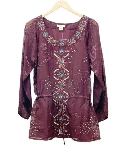 NEW Sundance Embroidered Sequined Long Sleeve Boho Wine Tunic Size Medium NWOT Boho tunic featuring... Show more