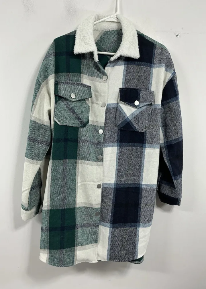 The Women's Shein Shirt Jacket in Medium size features a green/blue/white colorful plaid flannel des... Show more