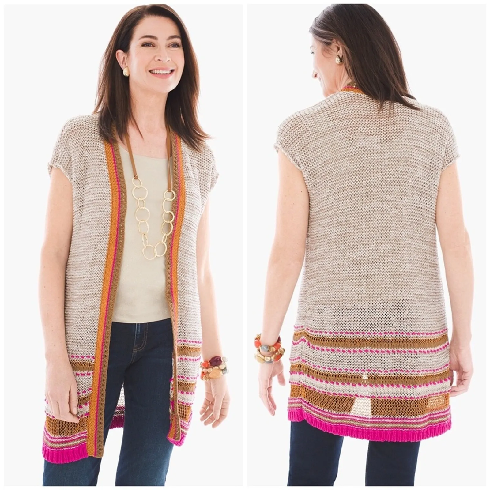 Open front Sleeveless Knit Striped hem Side slits Duster length Lightweight Cotton blend Length: 32”... Show more