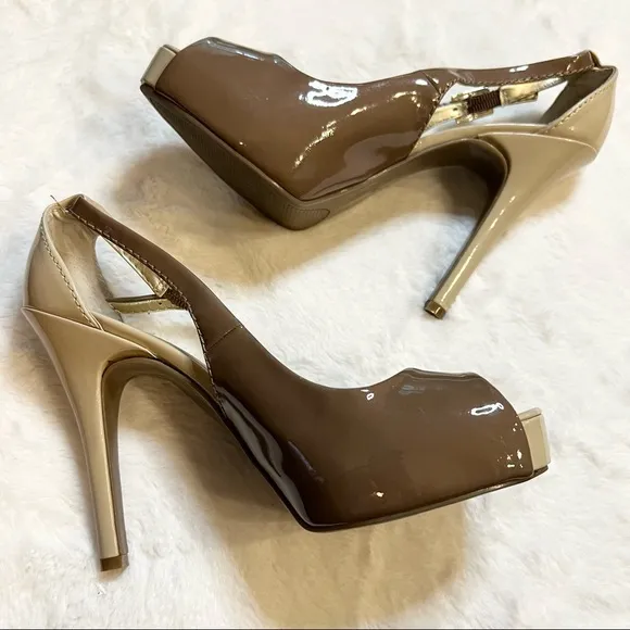 Worthington Taupe Two Tone Stiletto Heels Size 9.5 Faux Patent Leather Side Buckles Open Toe/ Peep T... Show more