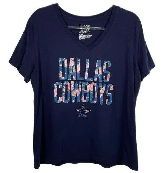 Her Style Dallas Cowboys Blue Floral Print Short Sleeve T-Shirt 2XL This t-shirt is in very good condition Dark blue, shows light wear Blue duty floral print lettering and logo on the front V-neck, short sleeves Length 27” Armpit to armpit 23 1/2” Lightweight, stretchy SS1467