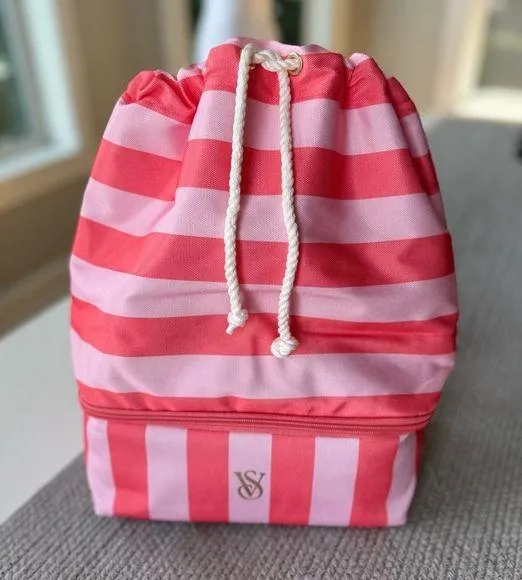 Victoria’s Secret pink and coral striped cooler backpack with insulated bottom zip cooler and drawst... Show more