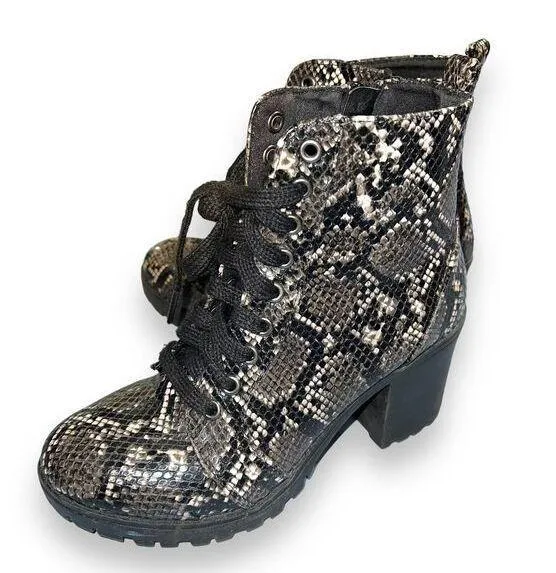 Snakeskin Ankle Boots Moto Combat Biker Chunky Heeled Time and Tru Condition: EUC excellent used con... Show more