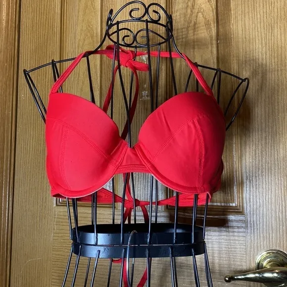 Old navy swimsuit top red size med ties around neck and back little padding in bra in good condi... Show more