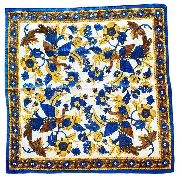 This square bold 70s Peacock Scarf by Nasharr Freres displays peacocks, foliage and flowers in baby blue, yellow and brown and has a floral border. This unique scarf is in great condition! 100% polyester Measurements: •21 x 21 inches Tags: midcentury, 70s, boho, cottagecore, peacocks, floral, bold, vivid, gypsy soul, unique