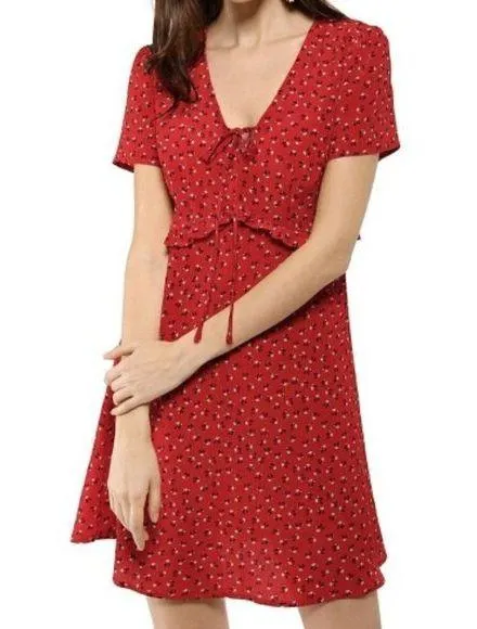 Allegra K Red Floral Ruffle Trim Short Sleeve Mini Dress Good used condition, minimal signs of wear. - V-Neck neckline - Short sleeves - Red backing - Floral printed - Tie bust detail - Mini length - Fit & flare style - Back zip closure - 100% polyester Measurements - Bust 18 - Length 33.5 All items ship from a smoke & pet free environment. All orders ship same or next business day.