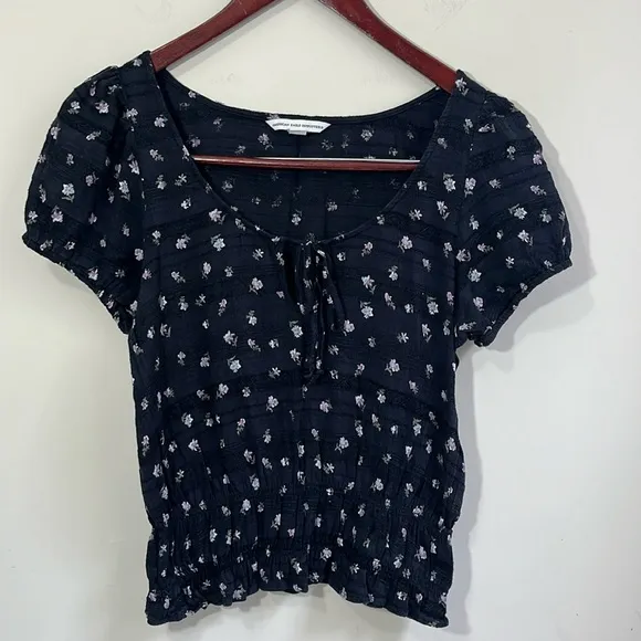 American Eagle women’s cropped blouse Size small Black with pink/white floral pattern Great preowne... Show more