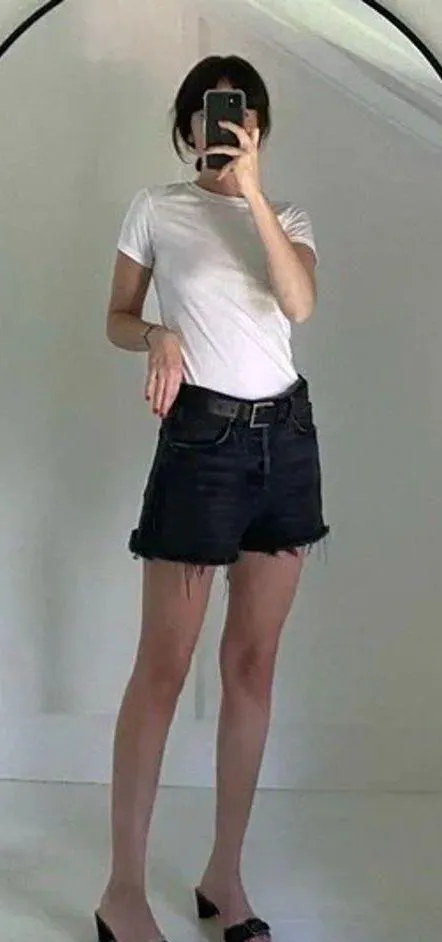Reformation Jeans faded black wash, ‘Dixie’ high rise jean shorts in wash, ‘Pacific’. Midweight, rig... Show more