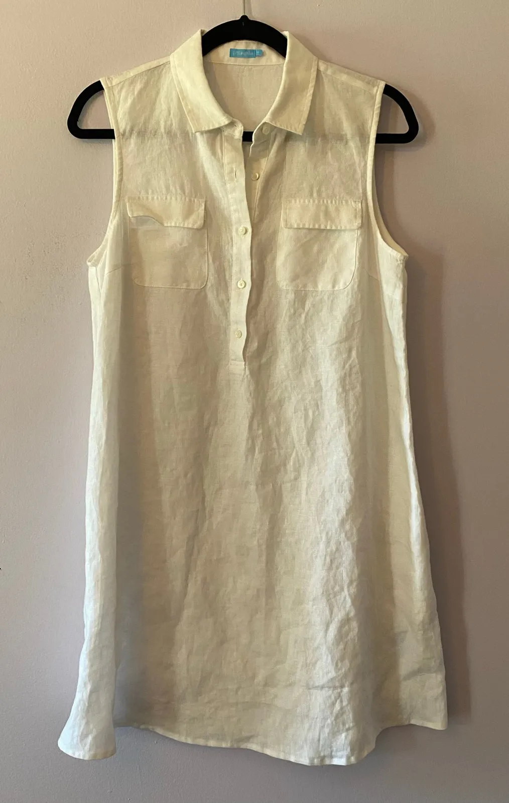 J. McLaughlin Women's size Medium White 100% Linen Sleeveless Button Down Dress. J. McLaughlin brand women's sleeveless dress in a size medium. White colorway in a 100% linen fabric. Lightweight and breathable. Buttons up the front. Two pockets at the chest. Small mark on the left pocket as pictured. Measurements as pictured. In great pre-owned condition, see photos for more details. Always feel free to ask any questions you may have! Reasonable offers accepted. linen, minimalist, summer, lightweight, sleeveless, button down