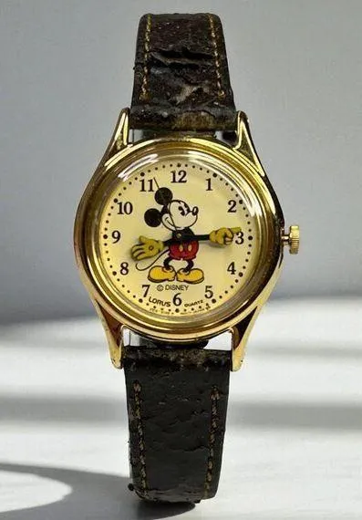 This vintage Lorus Disney watch features the iconic Mickey Mouse design on its dial, paired with a gold-tone case. A charming collector's piece. • Quartz movement for accurate timekeeping • Gold-tone case with classic design • Leather strap with buckle closure • Dial features Mickey Mouse detailing • Adjustable strap length • Watch runs and new battery installed Note: Leather strap shows significant wear, including peeling and cracking. Watch length = 7.5 inches.