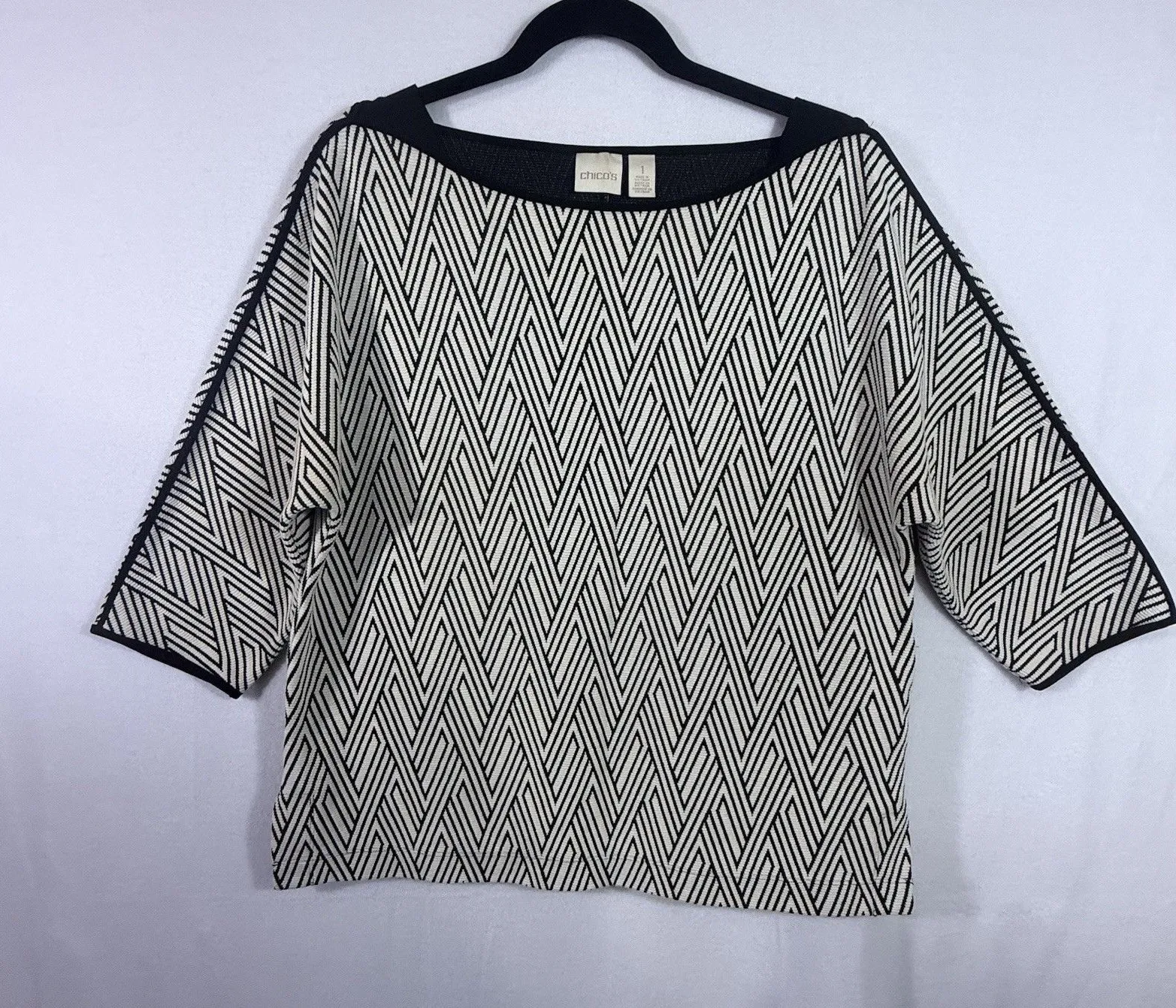 Chico's Cream Black Diamond Jacquard 3/4 Sleeve Top Blouse Size 1 US M Stretch Boxy Workwear Career... Show more