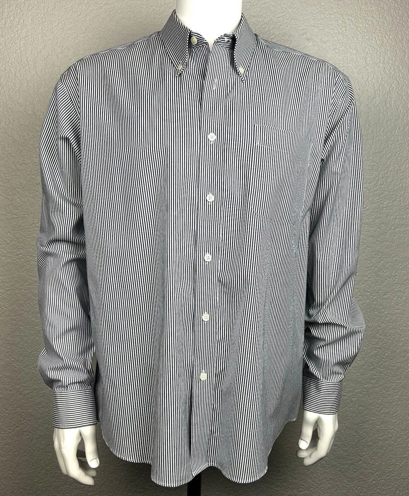This is an Eddie Bauer button-up shirt for men in size Large. It features blue stripes, a collared n... Show more