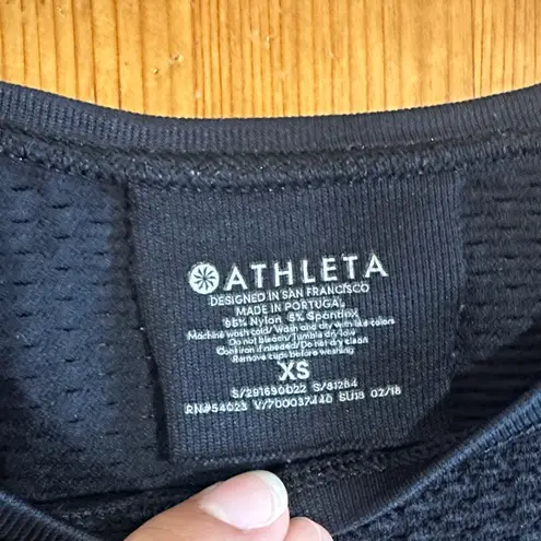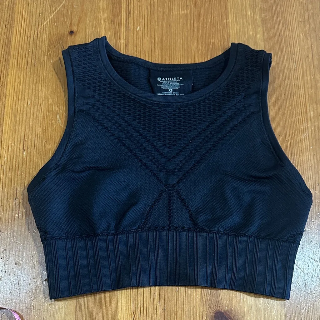 Athleta crop top in a deep blue shade. Features a textured pattern. Sleeveless design.