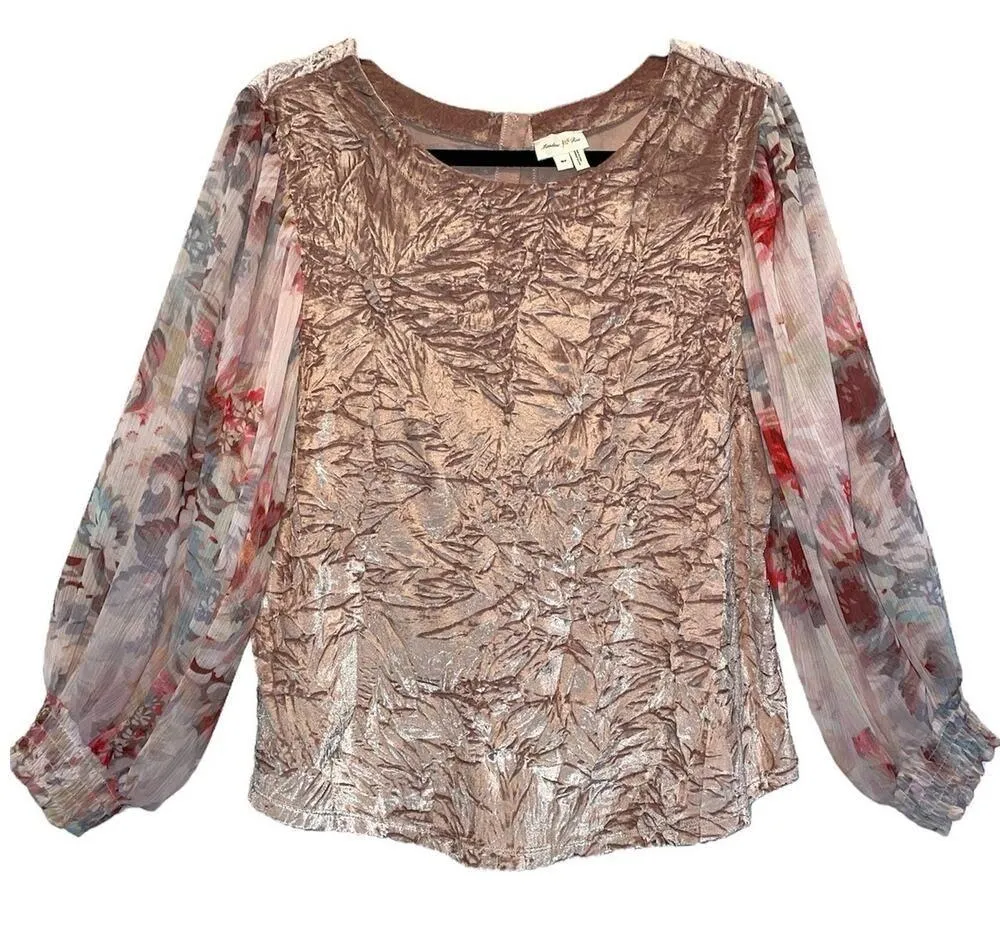 Anthropologie Meadow Rue boho blouse Gorgeous crushed blush pink velvet with chiffon floral sleeves.... Show more