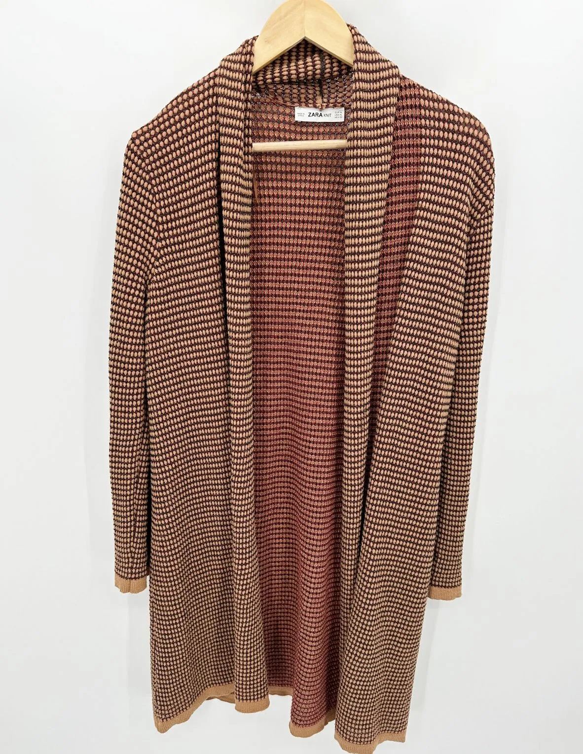 Tan, black, and red long sleeve open front knit cardigan sweater. Size: X-large (XL) Condition: P... Show more