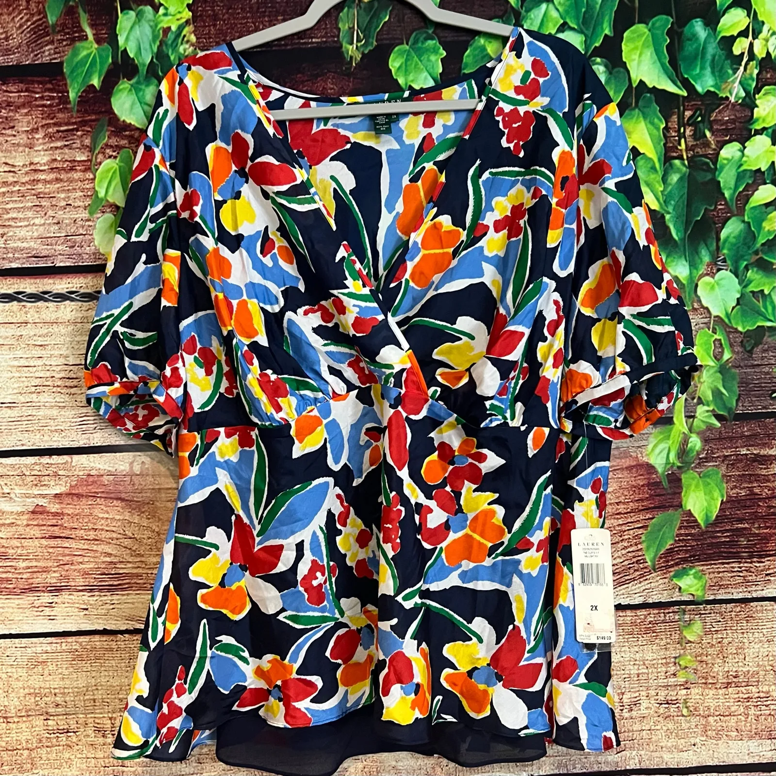 Lauren Ralph Lauren Multicolor Floral 100% Silk Wrap Front Blouse 2X Puff Sleeve Shirt Size 2X PTP... Show more