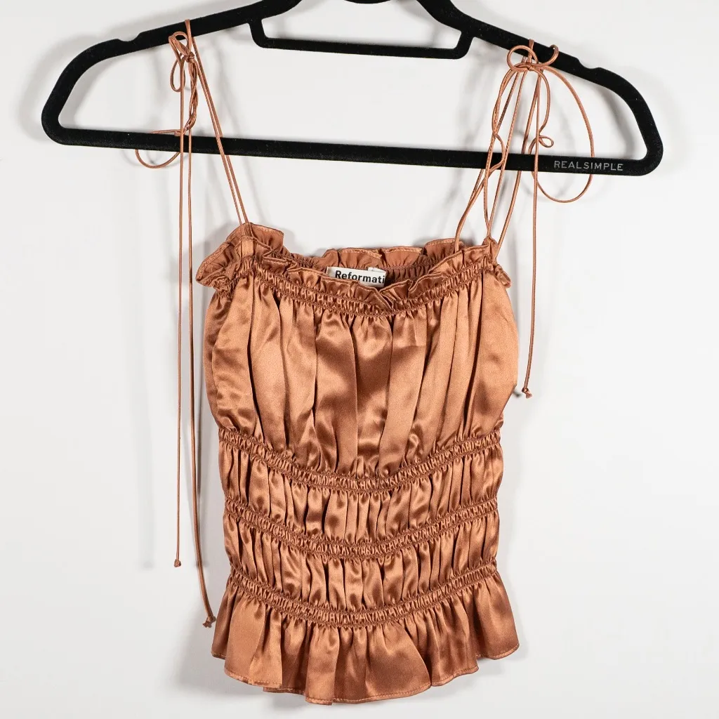 Reformation Viviana Ruched Cinched Silk Satin Tie Shoulder Tank Top Copper XS Pristine condition.... Show more