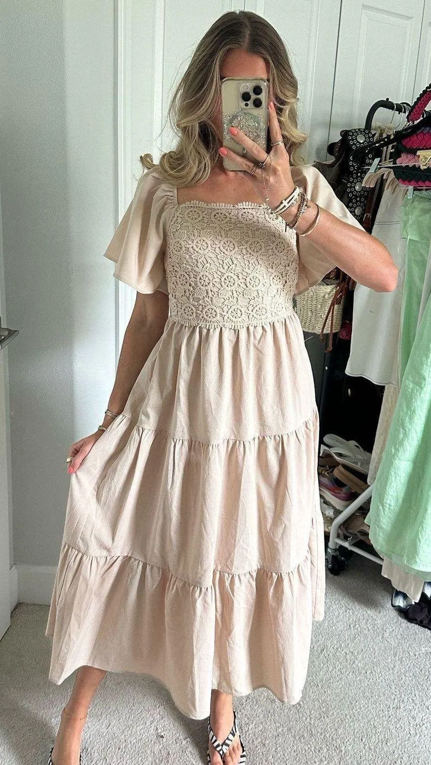 Baltic Born Maxi Dress size xsmall nwt. Baltic Born exclusive style Perfect dress for weddings, showers, or any special occasion Heavyweight crinkled chiffon with lace embellishment Creamy natural taupe color Straight cut neckline with lace scallop detail Lace overlay on bodice Bloused back bodice with functional tie Stretch elastic on back waistline Flutter sleeve with gathered elastic on shoulder Midi length skirt with three tiers Hidden pockets 100% Polyester