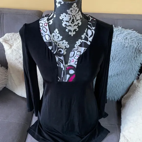 Beautiful CHICO’S TRAVELERS Black 3/4 Sleeve Top! Excellent condition! Colorful design of white, pin... Show more