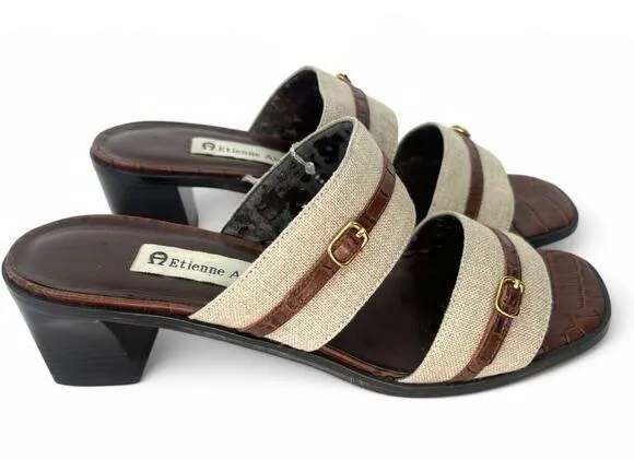 Etienne Aigner | 7.5 Linen Leather Chesapeake Block Heel Open Toe Heel Slip On Brown - $24 (80% Off Retail) - From Sourced In SoCa