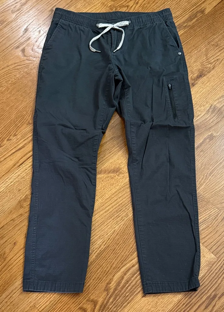Lightweight, durable, and easy to live in. These Vuori Ripstop pants feature a comfy elastic waistband with an adjustable drawstring, tapered straight leg, zip utility pocket at the thigh, front slash pockets, and back welt pockets (one zip). Soft 98% organic cotton/2% elastane ripstop fabric gives breathable stretch that’s perfect for travel, errands, hiking, or everyday athleisure. Color: black/charcoal. Care: machine wash cold, tumble dry low. Made in China. Excellent used condition—clean with no holes or stains noted. Some natural fading From a smoke-free and pet-friendly home. Open to reasonable offers. Usually ships same or next day. vuori ripstop pants, women’s utility pants, organic cotton stretch, elastic drawstring waist, zip pocket, tapered straight leg, travel hiking athleisure, black charcoal, size medium