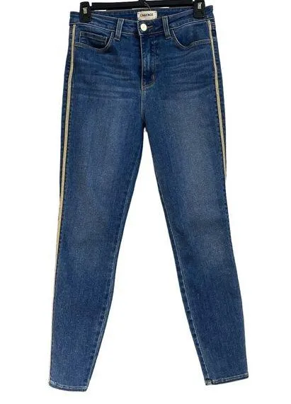 L’Agence SZ 27 Margot Skinny Jeans * Wash: Neptune * Gold Metallic Tuxedo Stripes * High-Rise * Stretch * 5-Pocket Design * Medium Wash * Whiskered * Zip-Fly ***There a several light marks/dots on the jeans. Please see the pictures. Please measure an existing pair of jeans to make sure these are the right fit for you. Waist: 26 1/2" Inseam: 26 1/4" Rise: 10" Leg Opening (side to side): 4 3/4" Measurements are approximate, laying flat and unstretched. Smoke free home.