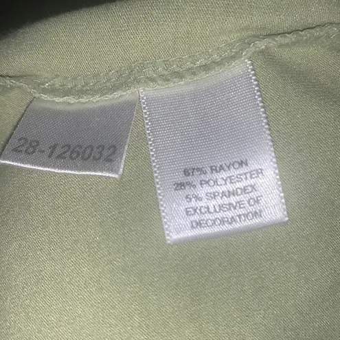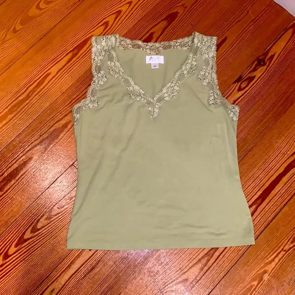 Pretty lace trim on green rayon polyester blend cami top. Beautiful condition, soft and comfy! Sleev... Show more