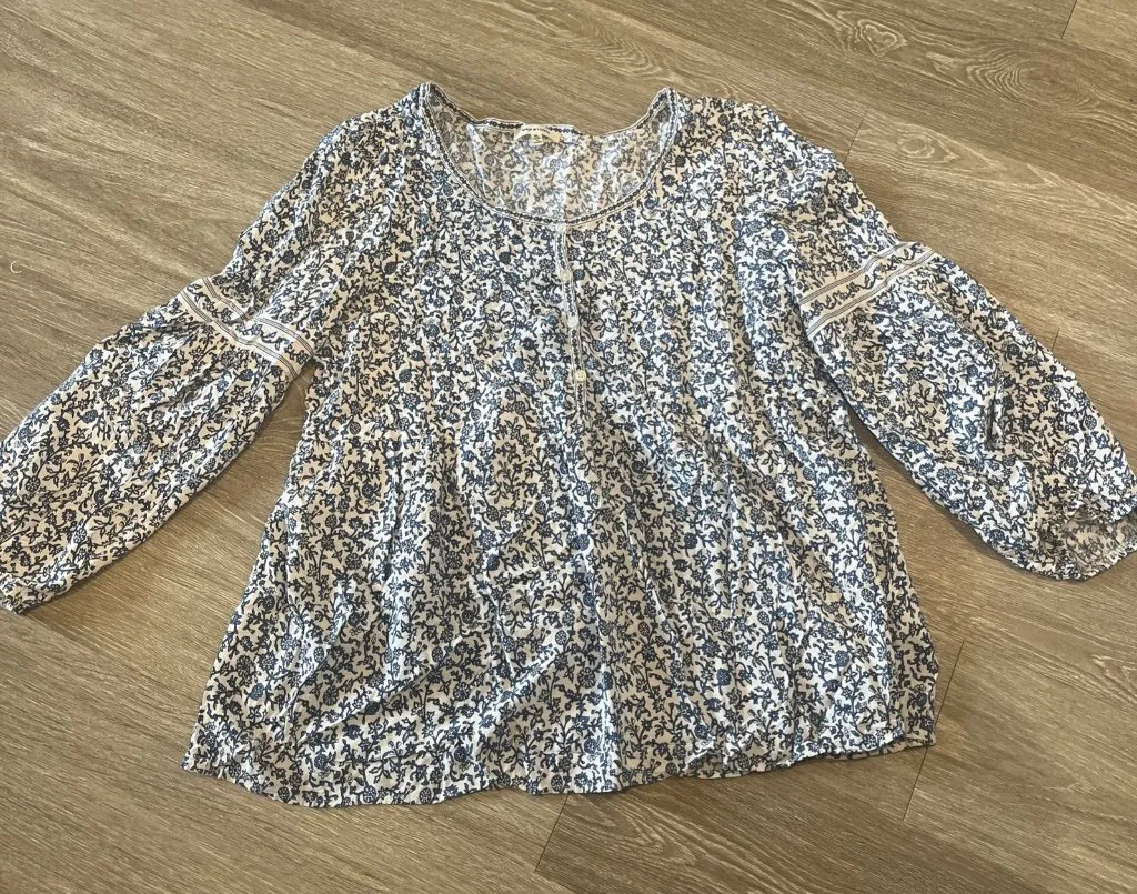 Max studio XL blue floral peplum 3/4 balloon sleeve cottage core blouse boho Bust 19” Length 25”