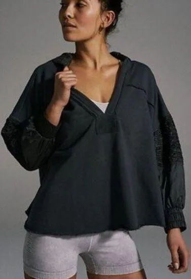 Excellent condition. Dark gray. Relaxed oversized fit. Pullover hoodie. Smocked sleeve accents. Elas... Show more