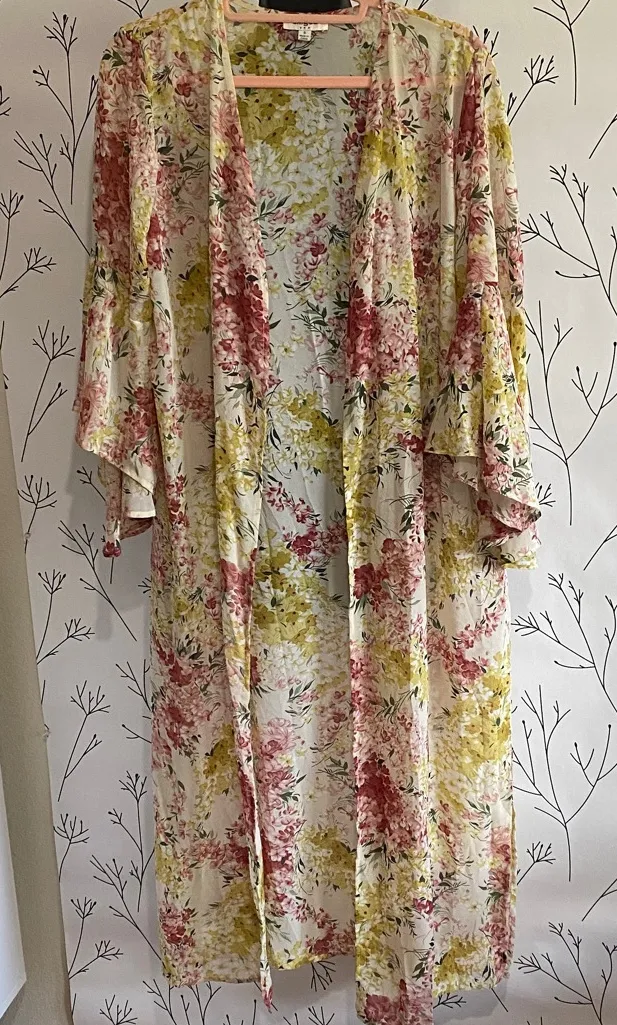 Flowy floral kimono cardigan. Features pink and yellow floral patterns on a cream background. Lightw... Show more