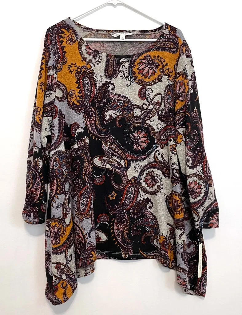 ◇ NEW WITH TAGS ◇ Zac & Rachel Woman ◇ Blouse in Black / Orange mt83oo6k5 / str4451 ◇ Plus size 3X ◇ blouse top shirt / knit top ◇ heather gray heathered grey / black / dark purple / lilac lavender purple / orange ish and/or mustard yellow ish golden ish / pink / red / blue / multi multicolor paisley print ◇ ruched gathered detail on sleeves / asym asymmetrical sharkbite handkerchief hem ◇ approx round neck and 3/4 sleeve ◇ long longer tunic length ◇ 97% polyester, 3% spandex - machine wash or hand wash, dry flat ◇ NWT - no flaws found ◇ MSRP $52 ◇ measurements (flat): (approx, may vary slightly) bust: 25.5 in (51") approx waist: 26 in (52") approx length: 27.5 - 30.5 in approx lvn ◇ boho bohemian hippie peasant preppy prep work office career wear to work business casual church fall autumn winter spring casual every day school weekend errands travel vacation brunch comfy cozy loungewear unique statement piece dopamine dressing loud colorful artsy artist art teacher art student modest mature modern