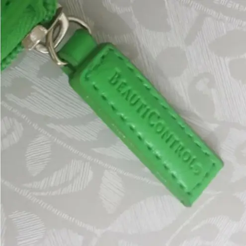 BeautiControl Green Vinyl Retro Zip Top Mini Bag Clutch Buckle Accents. Zipper works. Green poly-vinyl, silver-tone buckle accents. White with yellow floral satin like lining. Approx 9" x 3.5"