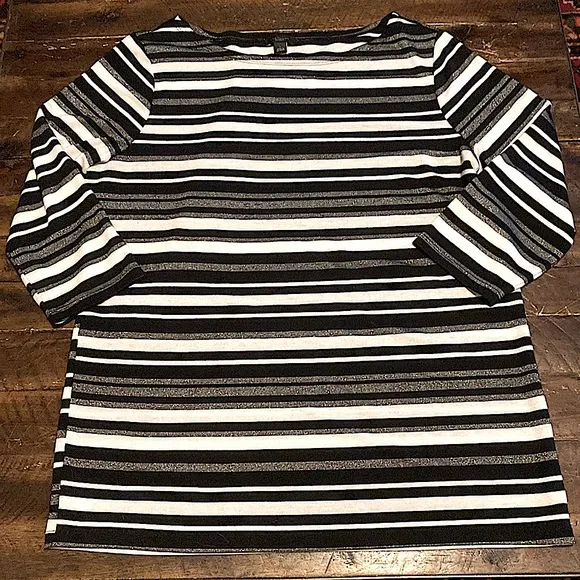 A lightweight sweater in black, white, and metallic silver from Ann Taylor Factory. 3/4 sleeves. A g... Show more