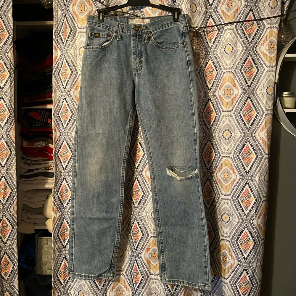 vintage lee straight leg jeans lee premium mid to low rise fit shown on 25 waist light wash thicke... Show more