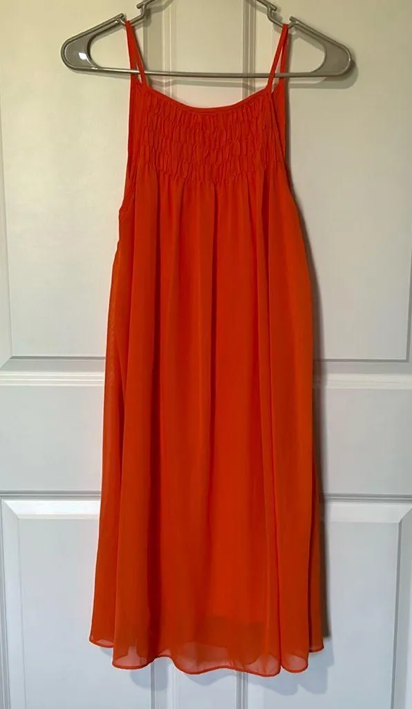Flowy, fun orange dress. Fully lined, tie at nape of neck. Hits above the knee. Size is Xl, I wear 6... Show more