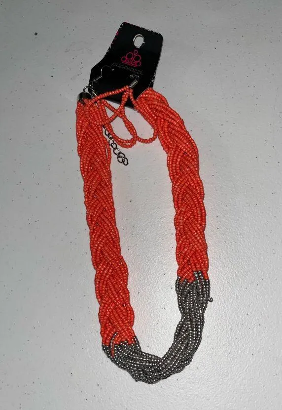 The NWT extravagant necklace & earring set is by Paparazzi, coral & grey / silver braided seed bead... Show more